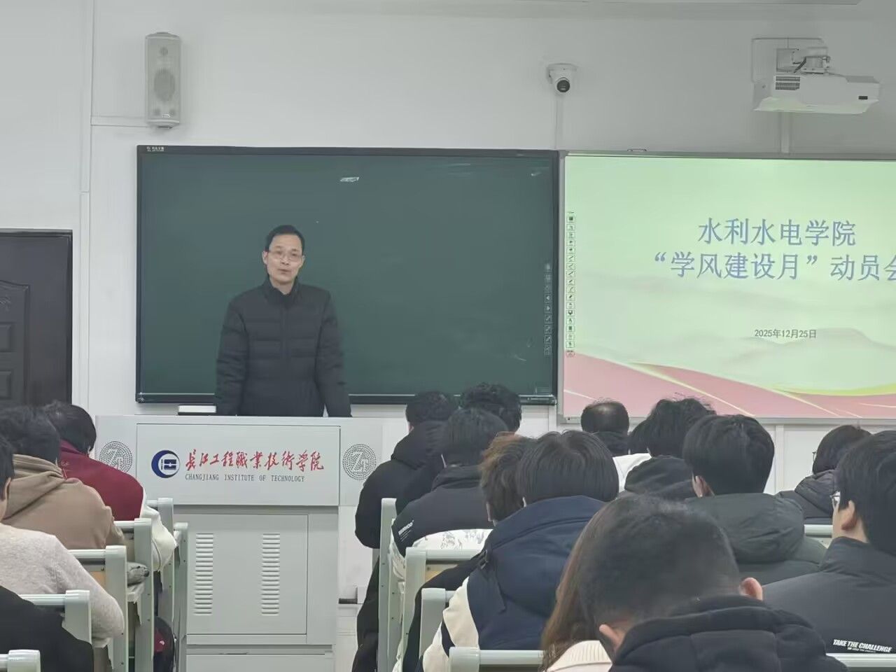 在各班通过班会开启学风建设月活动一周后,12月26日,水利水电学院学风建设月动员工作会于长江楼119教室正式召开。此次会议由学院学生党支部书记汪宏玮主持,学院党总支书记徐茂林、党总支副书记罗勇、学工部秘书毛钧、24、25级辅导员、文化大道和新城校区学生会主要干部以及各班班级干部等共计150余人,以线上线下同步的方式参会。