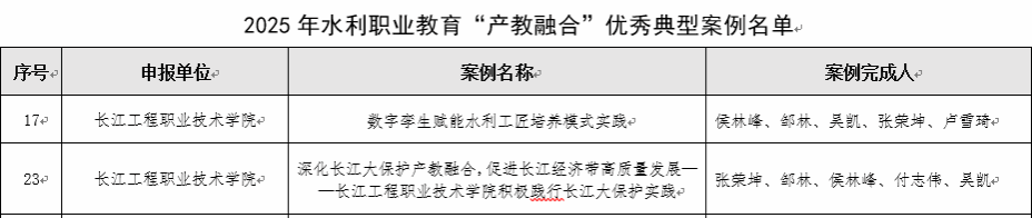 我校申报的《数字孪生赋能水利工匠培养模式实践》《深化长江大保护产教融合,促进长江经济带高质量发展 ——长江工程职业技术学院积极践行长江大保护实践》两项案例成功入选,进一步巩固了学校在水利职业教育产教融合领域的领先地位,为行业人才培养提供了可复制、可推广的 “长江工院方案”。