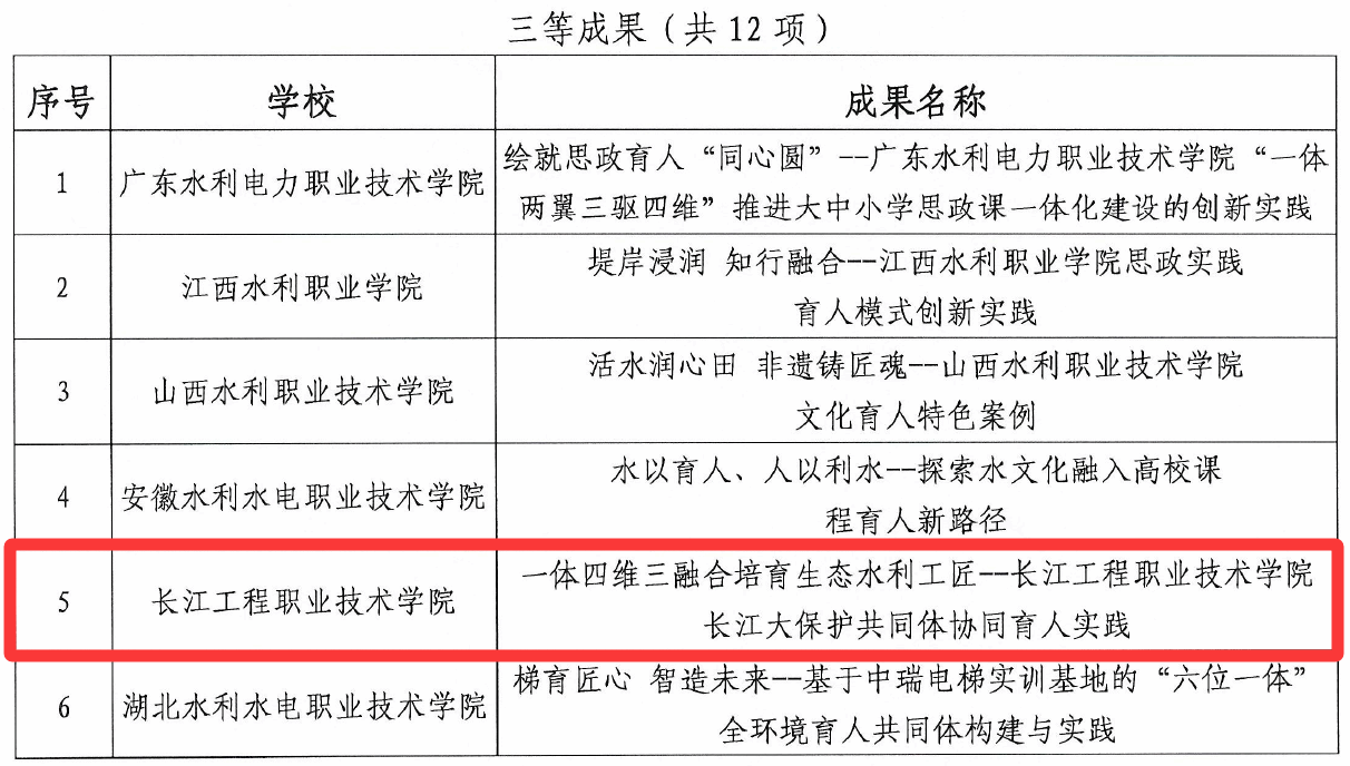 在同期开展的第四届水利德育教育优秀成果遴选工作中,学院成果《一体四维三融合 培育生态水利工匠——长江工程职业技术学院长江大保护共同体协同育人实践》获评高职院校三等奖,生动展现了学院依托长江大保护产教融合共同体,一体推进“党建引领、文化润心、赛创提技、实践赋能”四个维度建设,打造“党建红 水利蓝 生态绿”三色浸润育人新格局。