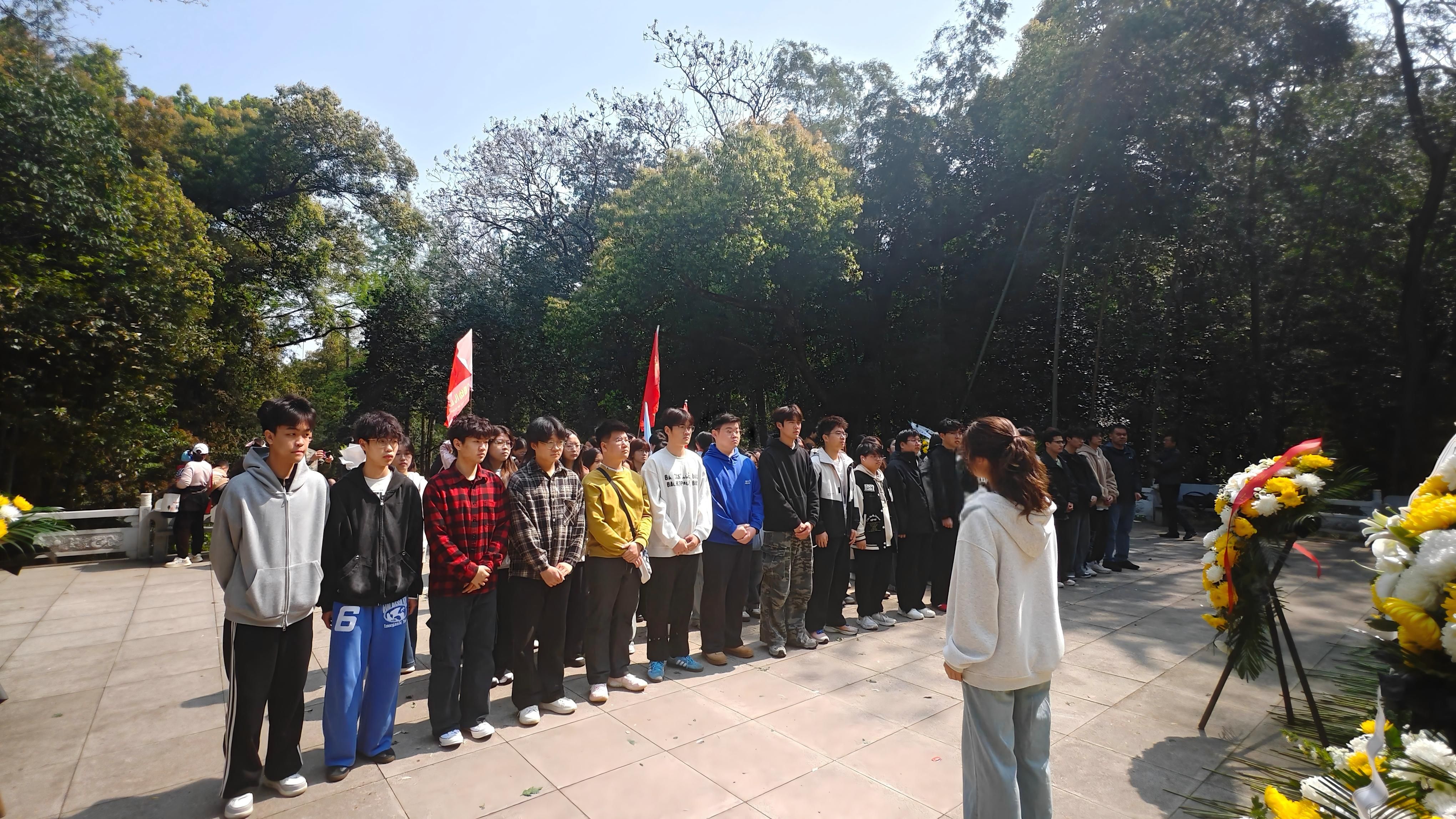 水利水电学院学工秘书毛钧、学生党支部书记汪宏玮带队参与此次活动。上午9时,全体师生在江夏区革命烈士纪念馆前集合,由学生代表敬献花篮,以此表达对革命先烈的崇高敬意和深切哀思;随后全体师生在烈士纪念碑下庄严肃立、整齐列队,深切默哀,抒发对党和人民的忠诚与热爱。默哀结束后,师生们有序参观纪念馆,深入学习党史,从革命先辈的奋斗历程中汲取奋进力量,进一步凝聚初心、激励斗志,切实增强历史使命感和政治责任感。