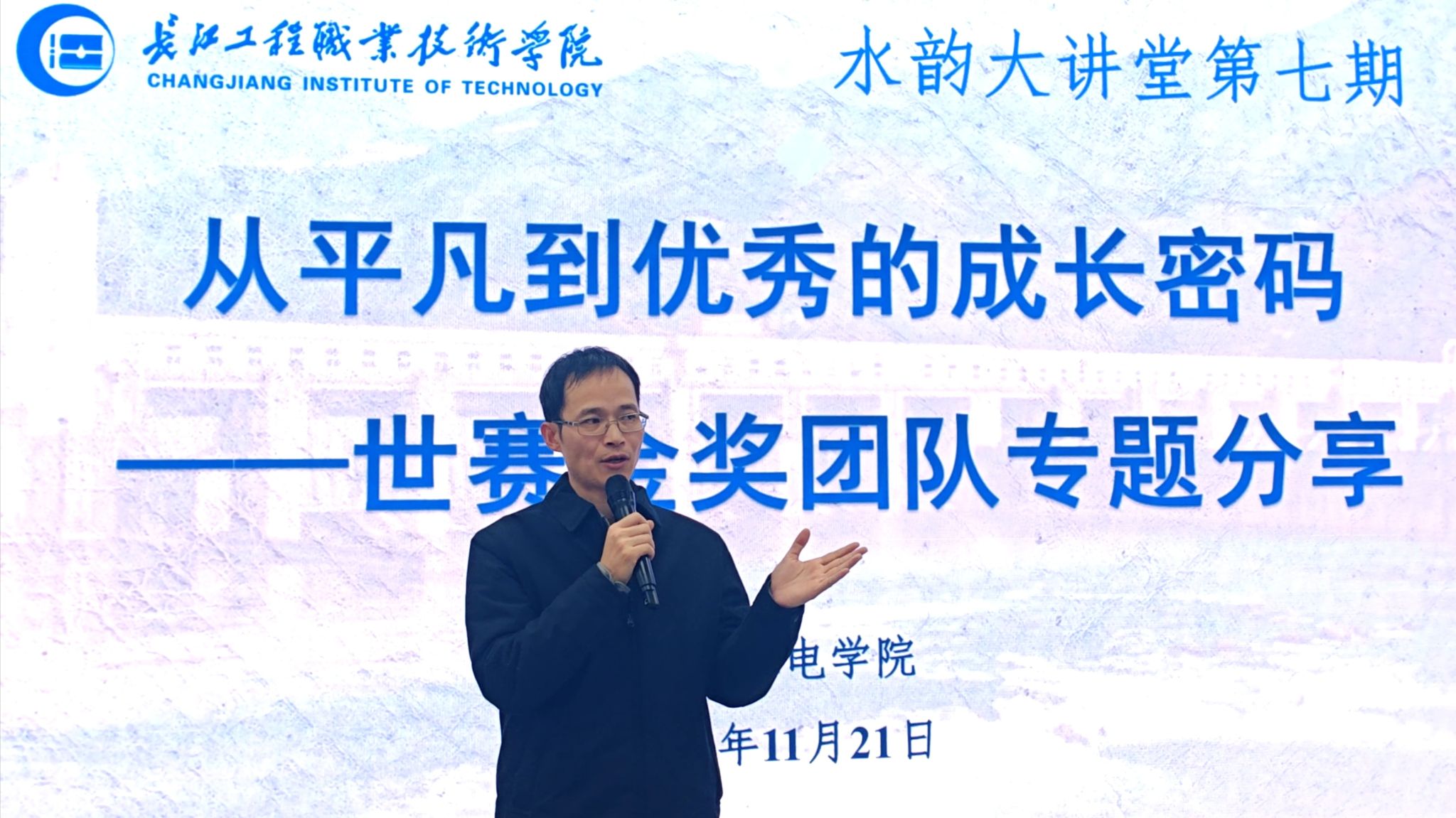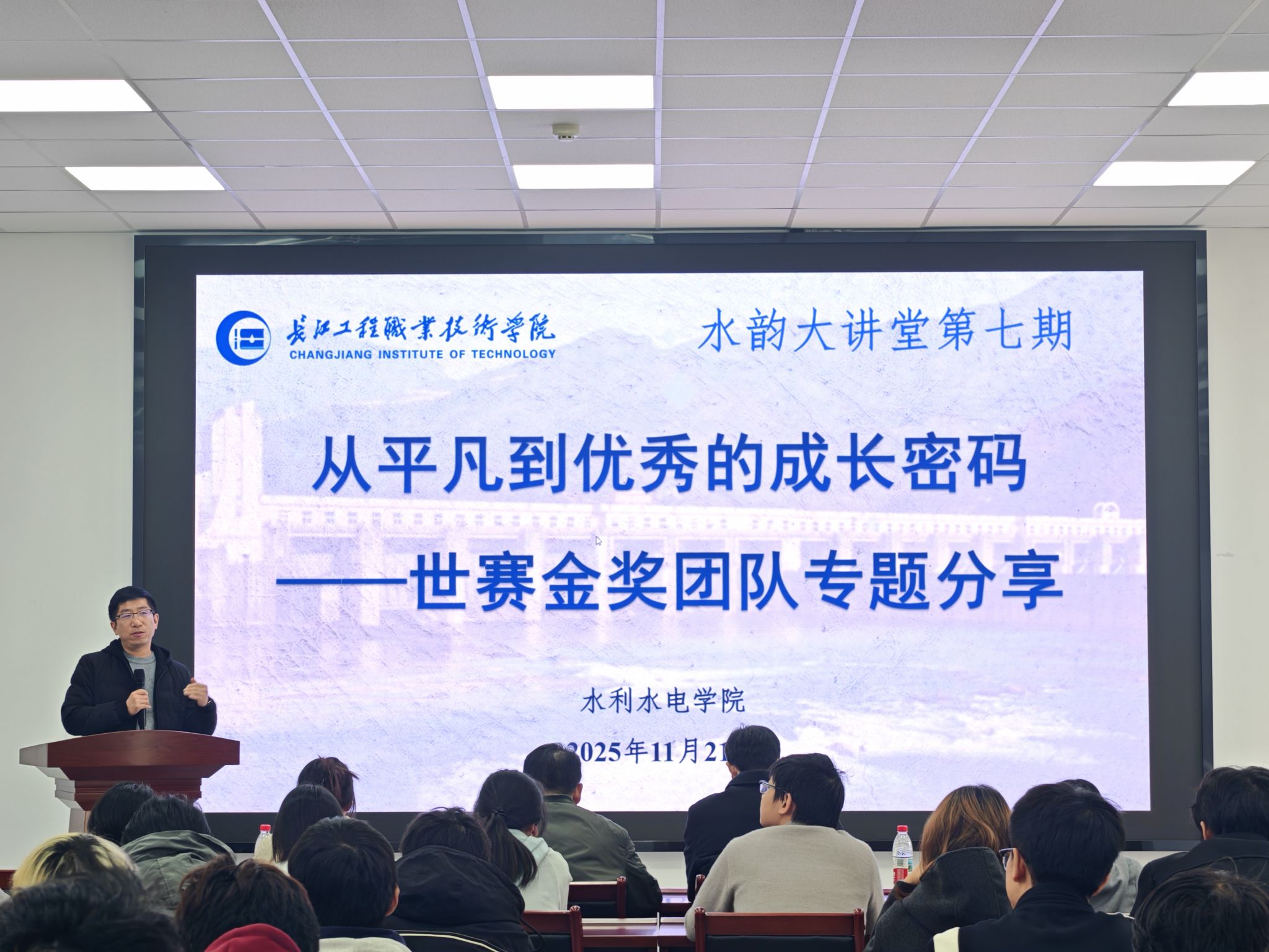 最后,学院党总支书记徐茂林在总结中表示,“水韵大讲堂”作为学院特色育人平台,始终以“榜样引领成长”为宗旨。他寄语25级新生:“金奖选手的故事证明,平凡与优秀之间只差‘坚持’二字。希望大家以此次分享为起点,在水利行业的广阔天地中,以技能为笔,以奋斗为墨,书写属于自己的成长华章。”